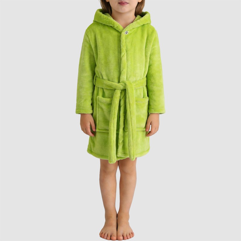 This girls' bathrobe features a classic solid color design, simple yet stylish, perfect for everyday wear at home or for keeping warm before bed. The hooded design provides warmth and comfort, effectively protecting against the evening chill; the front snap closure makes it easy to put on and take off while ensuring a secure fit. The double pockets are both practical and convenient for warming hands, and the adjustable waist tie allows for a comfortable and flattering fit, adding a touch of cuteness. The overall fabric is soft and fluffy, providing comfort and warmth, allowing your child to enjoy warmth and peace of mind during the winter months.