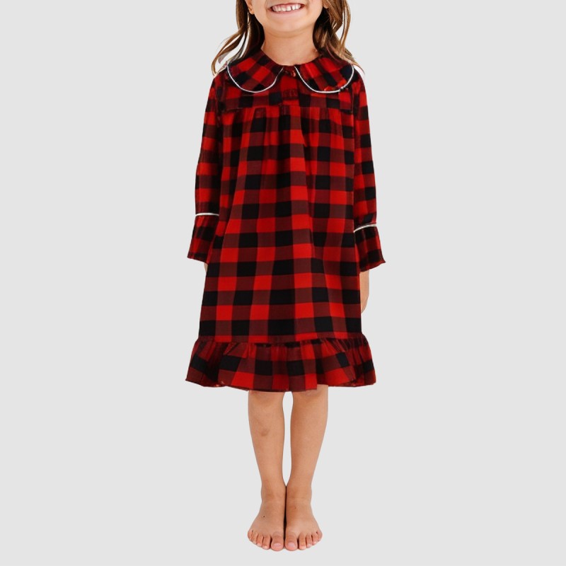 This girls' nightgown features a comfortable and classic plaid design, combining practicality and sweetness.  Suitable for home and sleepwear, it keeps children comfortable and warm while they rest. The lapel design adds an elegant touch, and the long sleeves provide warmth, making it ideal for autumn and winter. The ruffled details at the cuffs and hem add overall texture and a delicate feel. The loose fit allows for freedom of movement and a comfortable, natural feel.
