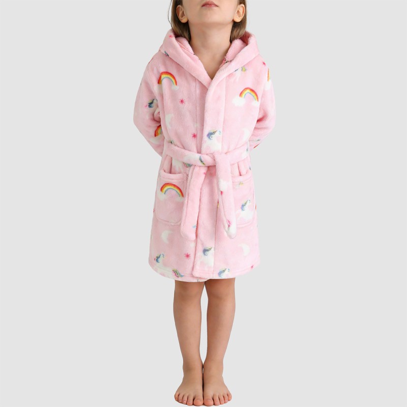 This girls' bathrobe features a stylish print and offers both warmth and comfort, making it the ideal choice for home wear in autumn and winter. It keeps your child warm and adorable at home. The soft plush fabric is comfortable to the touch and provides excellent warmth. The hooded design adds cuteness and extra warmth, while the long sleeves fully cover the arms for enhanced insulation. The double pockets are convenient for storing small items or keeping hands warm, and the adjustable waist tie ensures a comfortable and secure fit. The loose fit allows for unrestricted movement.