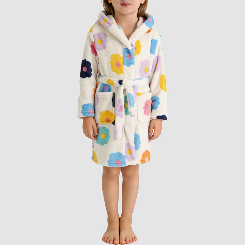 This girls' bathrobe features a charming floral print design, offering both sweetness and cuteness, along with warmth and comfort, making it an essential item for home wear in autumn and winter. The soft plush fabric with a fleece lining provides a warm and delicate feel, enhancing overall warmth. The hooded design adds a touch of fun and extra warmth, while the long sleeves cover the arms for comfortable wear. The double pockets are convenient for storing small items or warming hands, and the waist tie allows for adjustable fit. The loose fit allows children to move freely and comfortably.
