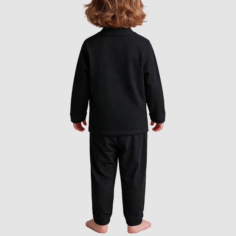 This boys' pajama set features a simple design, with a clean and elegant style, perfect for everyday wear and sleeping. The top has a classic lapel design with button closure for easy on and off, adding a touch of sophistication. The long sleeves provide good coverage for the arms, suitable for multiple seasons. The decorative chest pocket adds layers and details to the overall look, making the pajamas more stylish and less monotonous. The pants feature an elastic waistband that conforms to the waistline without being too tight, ensuring a secure and comfortable fit; the straight-leg design provides ample room for movement, making it easier to walk and turn over in bed.