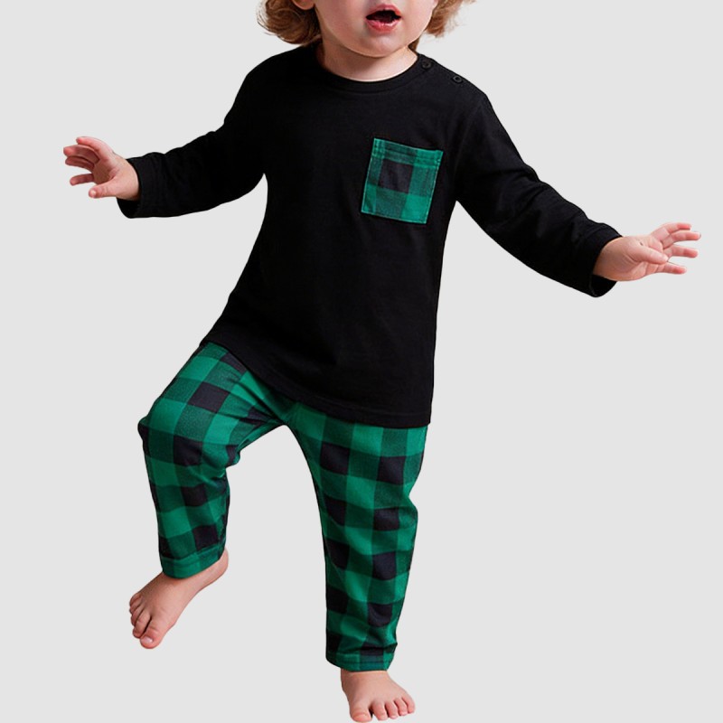 This boys' pajama set features a casual and comfortable style, combining practicality with playful design, suitable for everyday wear, sleeping, and light activities. The top has a simple round neck design that fits the neck curve, making it easy to put on and take off without being constricting. A plaid pocket on the chest adds a touch of detail to the simple design, increasing visual interest and adding a lively touch to the overall look. The pants feature a matching plaid print, complementing the top's pocket for a coordinated and stylish look. The elastic waistband fits comfortably without being too tight or slipping down, making it easy for children to put on and take off independently.