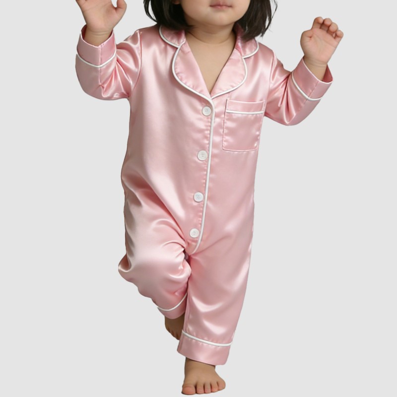 This girls' lightweight one-piece pajama features a silky soft fabric that is light, breathable, and comfortable against the skin, making it perfect for spring and summer or indoor wear. The overall design balances practicality with a playful touch, allowing children to move freely while maintaining a cute and charming look. The classic lapel design is simple and elegant, adding a touch of sophistication, while the long sleeves provide good coverage. The front button closure makes it easy to put on and take off, allowing children to easily manage it themselves. Decorative pockets on the chest add detail and visual interest, making the pajamas not only comfortable but also stylish and adorable.